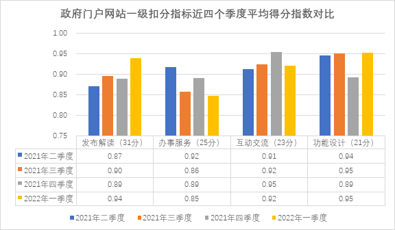 图1 政府门户网站一级扣分指标近四个季度平均得分指数对比
