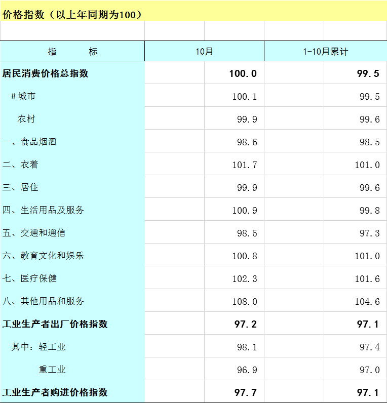 2025年1-10月广西价格指数(以上年同期为100)
