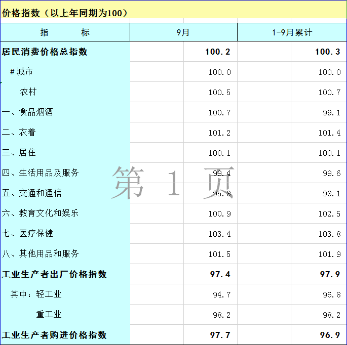 2024年1-9月广西价格指数(以上年同期为100)