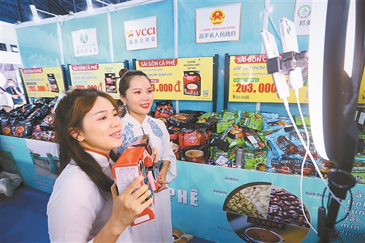 ①9月18日,在东博会越南馆,工作人员在进行直播带货。徐天保 何学俏/摄
