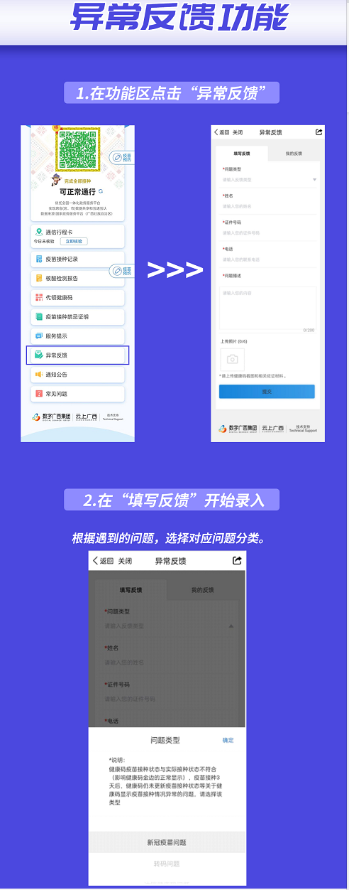 (一)通过广西健康码“异常反馈”功能、12345政务服务热线、所在市县(区)指挥部等渠道反馈。