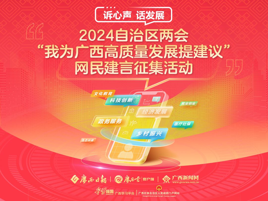 旧岁已展千重锦,新年再进百尺竿。2024年是新中国成立75周年, 是实施“十四五”规划的关键一年,是广西经济社会发展的重要一年。2024自治区两会期间,广西云客户端开展“我为广西高质量发展提建议”网民建言征集活动,诚邀网友提建议、诉心声、话发展。您的真知灼见,将有机会直达自治区两会现场,得到代表委员的回复。