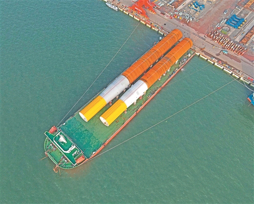 5月10日上午,在位于中国(广西)自由贸易试验区钦州港片区的广西文船重工有限公司2号码头上,单体长108米、外径9.1米、单体重达1900吨的两套单桩被固定装载在一艘货轮上,发往海南。这标志着广西海洋装备企业生产制造的首个海上风电单桩项目首批产品圆满完工交付。