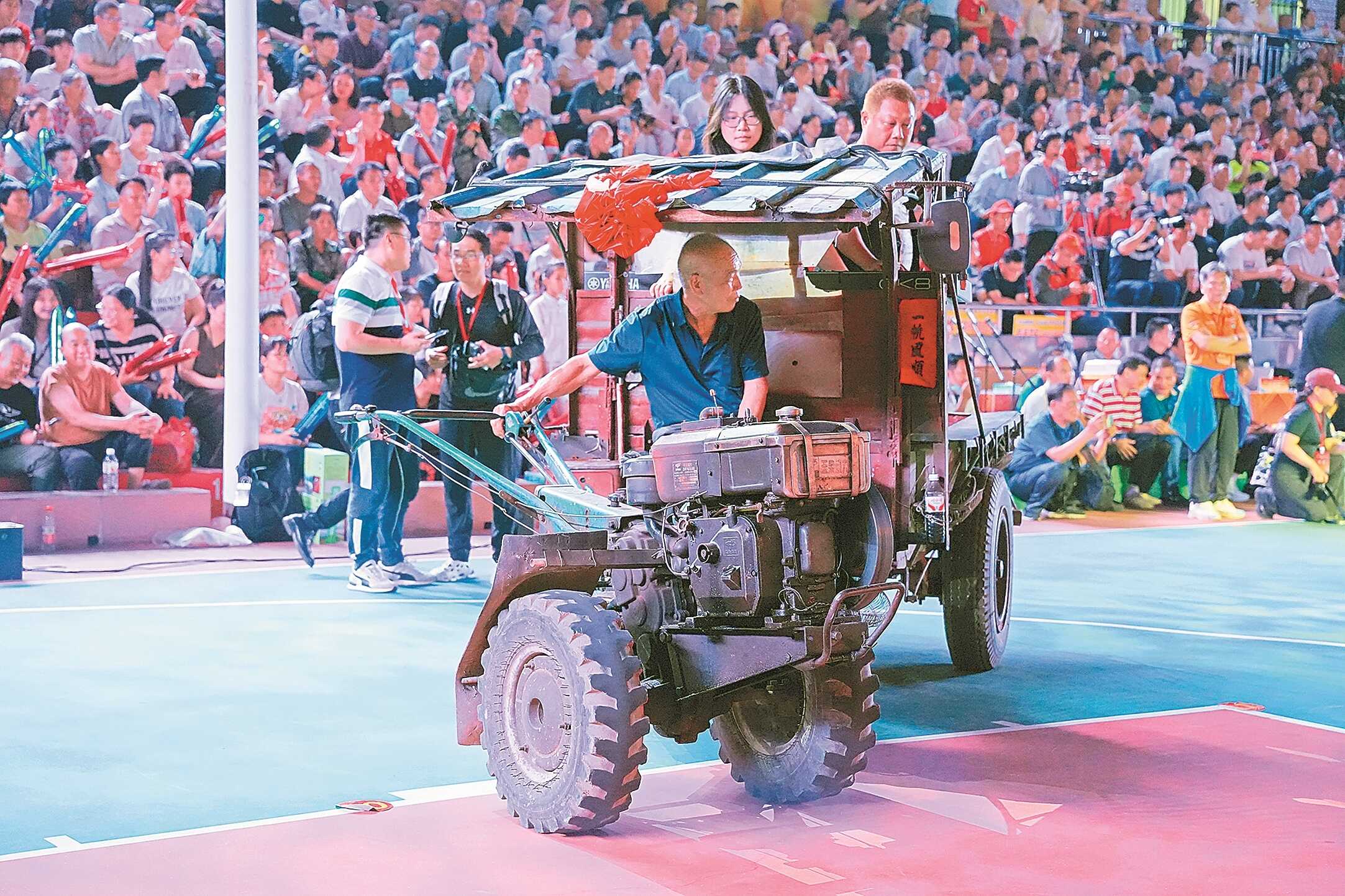 广西制造的“铁牛”载着歌手开上第九届广西万村篮球赛总决赛开幕式现场。 金翔义 摄