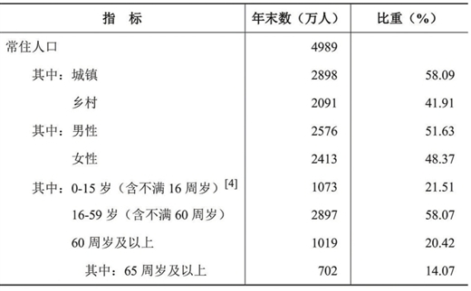 年末常住人口[3]4989万人,比上年末减少24万人,其中城镇人口2898万人,占常住人口比重(常住人口城镇化率)为58.09%,比上年末提高0.70个百分点。全年出生人口36.0万人,出生率为7.20‰;死亡人口40.5万人,死亡率为8.10‰;自然增长率为-0.90‰。