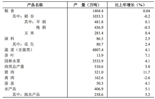 全年粮食总产量1404.4万吨,比上年增加0.6万吨,增产0.04%。其中,春收粮食产量29.3万吨,减产2.0%;早稻产量481.8万吨,增产0.1%;秋粮产量893.3万吨,增产0.1%。全年谷物产量1318.5万吨,减产0.1%。其中,稻谷产量1033.3万吨,减产0.2%;玉米产量281.4万吨,增产0.4%。