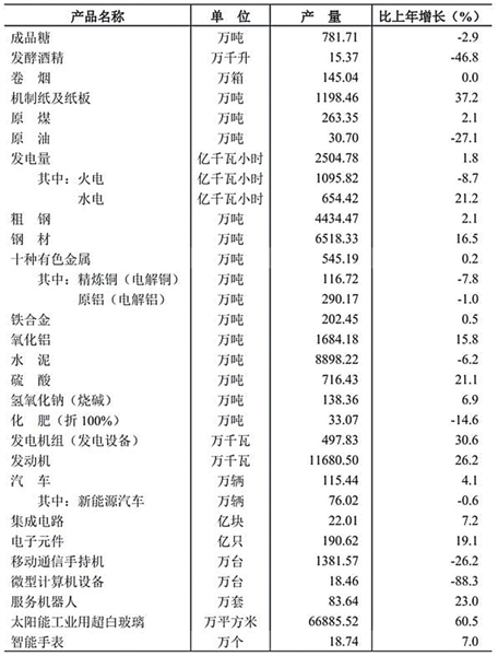 全年规模以上工业企业原煤产量比上年增长2.1%,原油产量下降27.1%,发电量增长1.8%,规模以上水电、核电、风电、太阳能发电等清洁能源发电量分别增长21.2%、8.0%、1.3%、4.6%。全年规模以上工业企业电力消费量增长5.3%。
