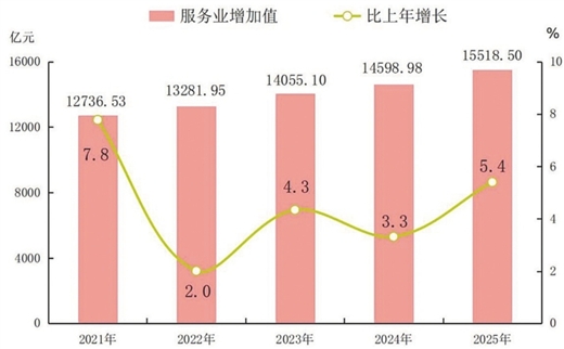全年批发和零售业增加值2758.79亿元,比上年增长5.5%;交通运输、仓储和邮政业增加值1165.22亿元,增长5.6%;住宿和餐饮业增加值487.64亿元,增长4.8%;金融业增加值1546.17亿元,增长2.6%;房地产业增加值1869.39亿元,增长1.9%;其他服务业增加值7504.41亿元,增长7.1%。部分服务行业规模以上企业营业收入比上年增长5.3%。