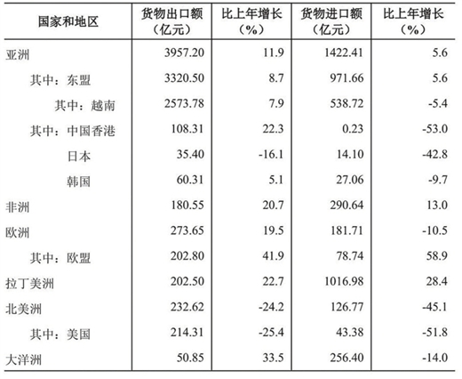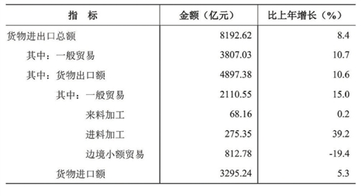 全年货物进出口总额8192.62亿元,比上年增长8.4%。其中,出口4897.38亿元,增长10.6%;进口3295.24亿元,增长5.3%。进出口顺差(进口小于出口)1602.14亿元。对共建“一带一路”国家进出口额6688.53亿元,比上年增长11.0%。其中,出口4012.69亿元,增长11.8%;进口2675.83亿元,增长9.8%。对《区域全面经济伙伴关系协定》(RCEP)其他成员国[24]进出口额4731.53亿元,比上年增长6.1%。其中,出口3464.50亿元,增长8.6%;进口1267.04亿元,下降0.4%。