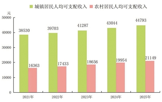 图8 2021—2025年广西城乡居民人均可支配收入