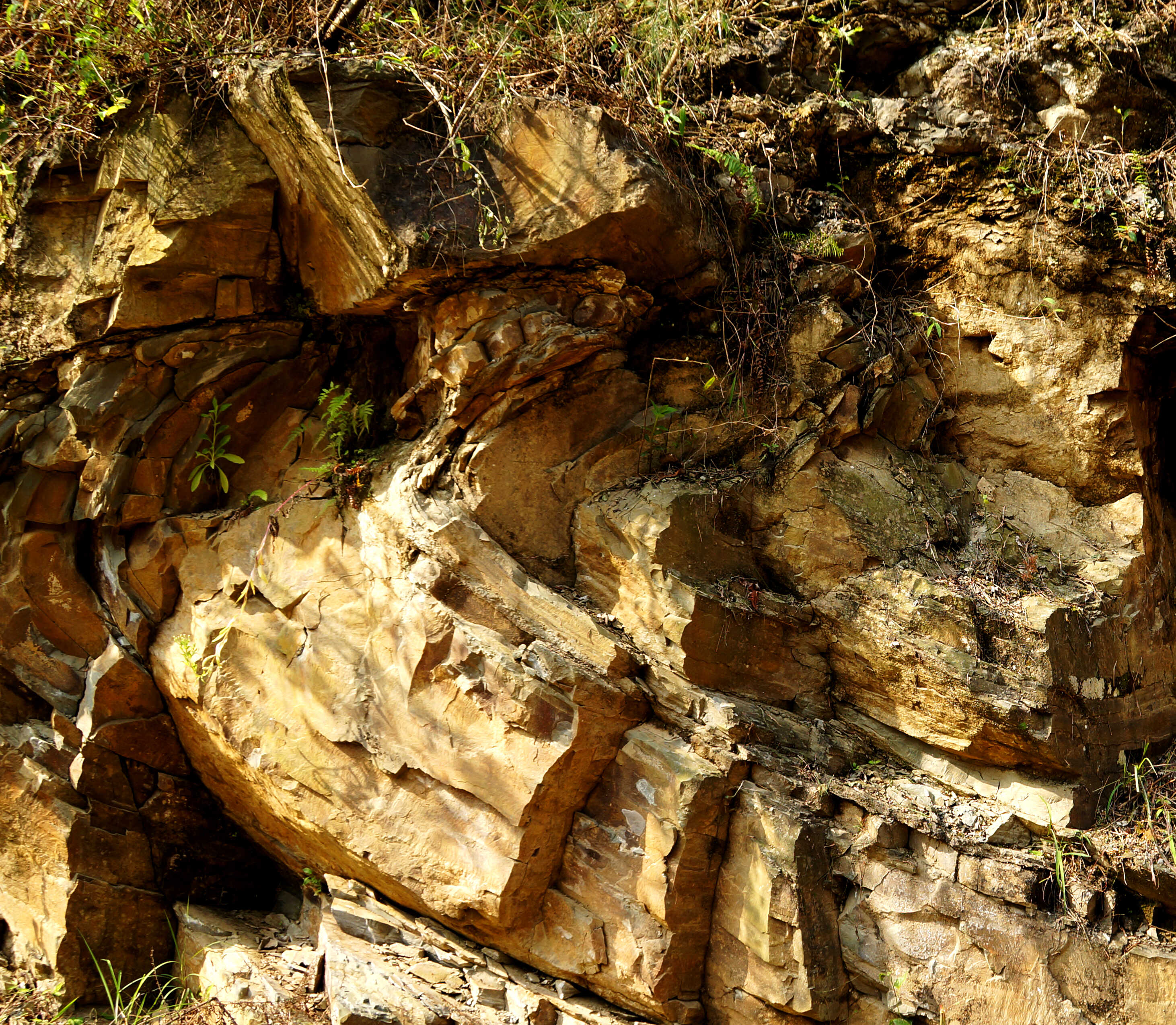 褶皱由中三叠统兰木组的杂砂岩与粉砂岩、泥岩组成,呈不对称平卧状,岩层层叠褶曲,往上向一块状岩层(右上角)的底面收敛,形如弯钩。它与上覆的块状泥质混杂砾岩间为一沉积界面,而非断裂构造面。上覆岩层灰岩、砂岩、泥岩砾石混杂于泥质中,塑性变形构造发育——此类混杂砾岩在桂西被称为沉积混杂岩。这一褶皱是滑塌构造,由混杂岩沉积流体快速向斜坡下运移堆积,对下伏沉积层产生向坡下的同生拖曳作用所形成。