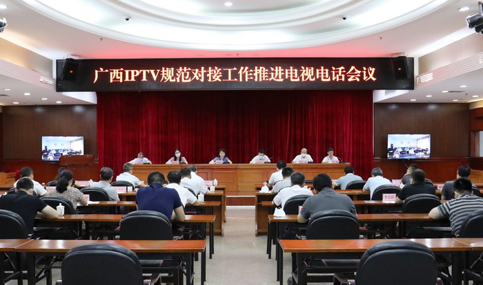 二是再动员再部署,落实问题整改。为切实完成国家部署的IPTV规范对接工作任务,2020年6月2日,自治区广电局召集广西通信管理局、广西广播电视台、中国电信广西公司、中国联通广西分公司、广西广电网络公司、广西广电新媒体公司及各市文广旅局等相关单位的负责同志召开广西IPTV规范对接工作推进电视电话会议,自治区广电局党组成员、副局长吴晓丽出席会议并讲话。会议再次明确广西IPTV规范对接的时限、标准、目标、验收等事项,对IPTV规范对接工作进行再部署再推进。
