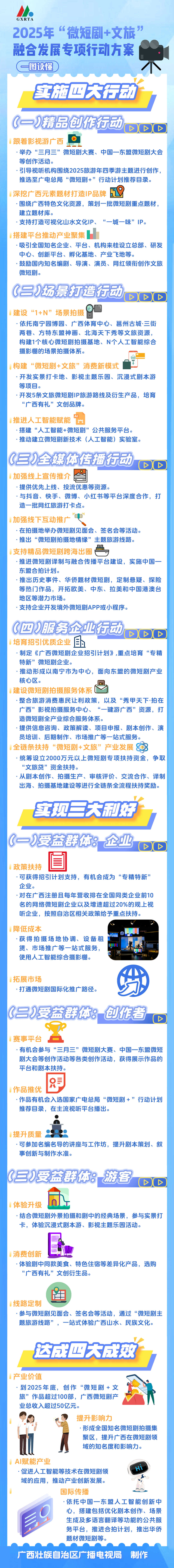 近日,自治区广电局、自治区文化和旅游厅联合印发《2025年“微短剧+文旅”融合发展专项行动方案》,通过实施开展“四大行动”,到2025年底实现创作“微短剧+文旅”作品超过100部,广西微短剧产业总收入超过50亿元,推出一批现象级微短剧作品,带动打造一批现象级景点(景区),推动“微短剧+文旅”生态全面升级。