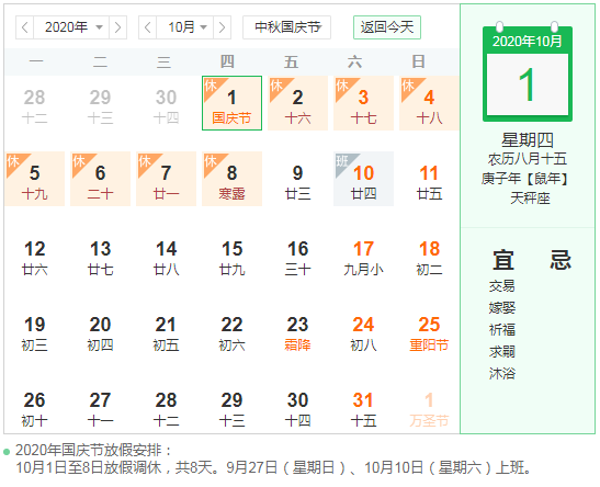 根据国务院的安排,2020年“中秋、国庆”期间,2020年10月1日至8日放假调休,共8天。根据《重大节假日免收小型客车通行费实施方案》,高速公路实行免费通行政策。