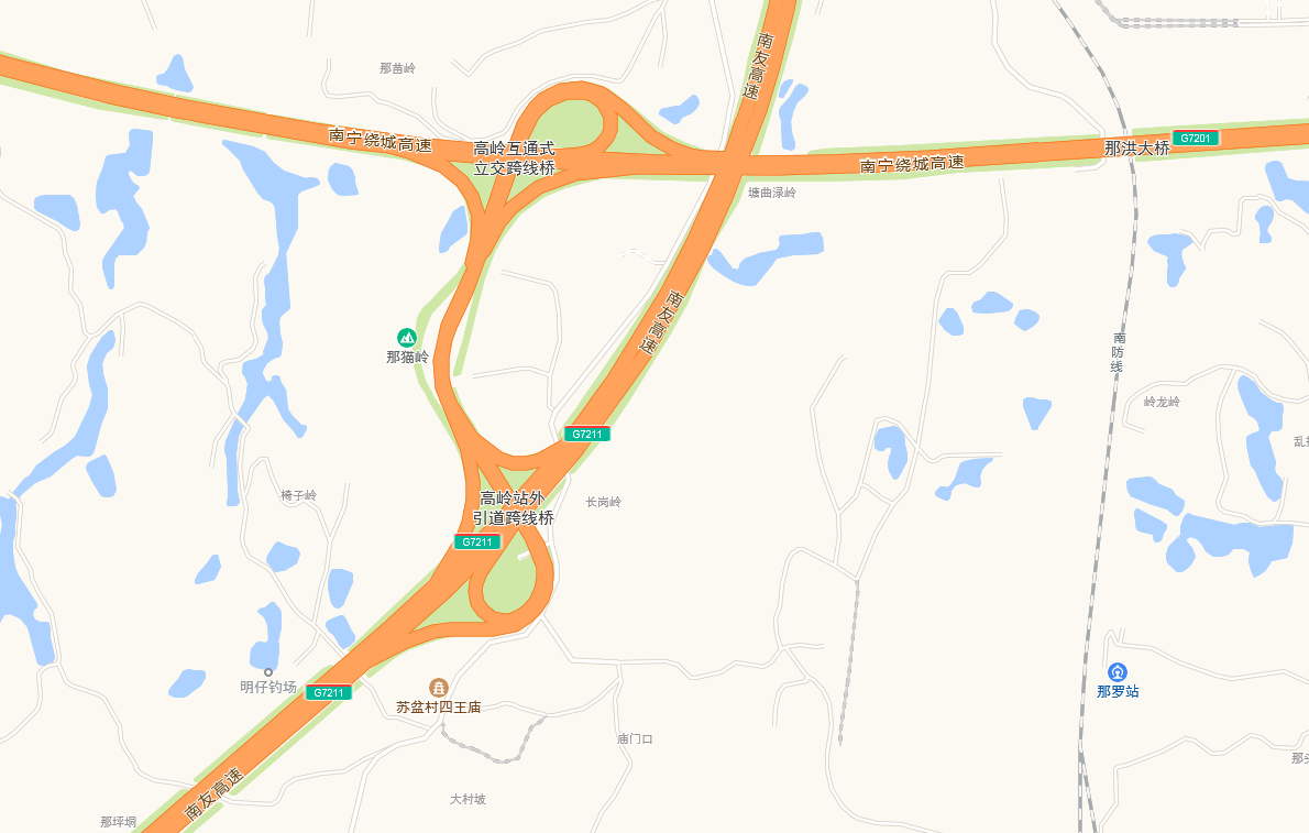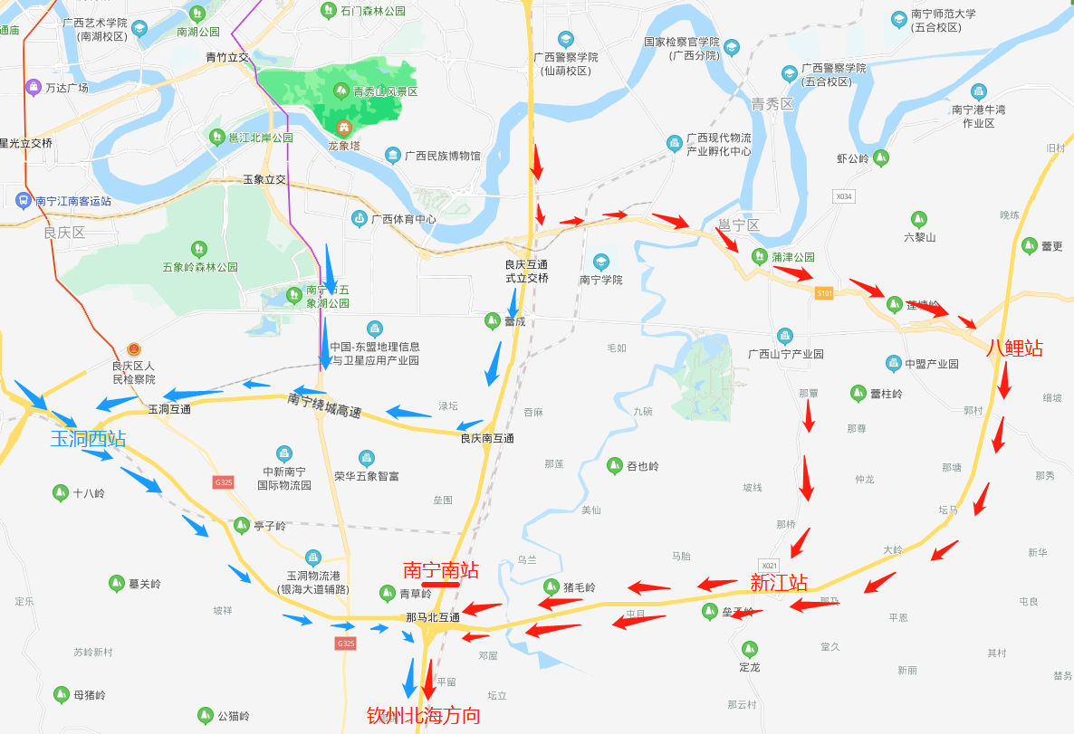 2.从良庆南互通立交→玉洞西收费站→那马北互通立交匝道往G75兰海高速防城港、钦州、北海方向行驶。