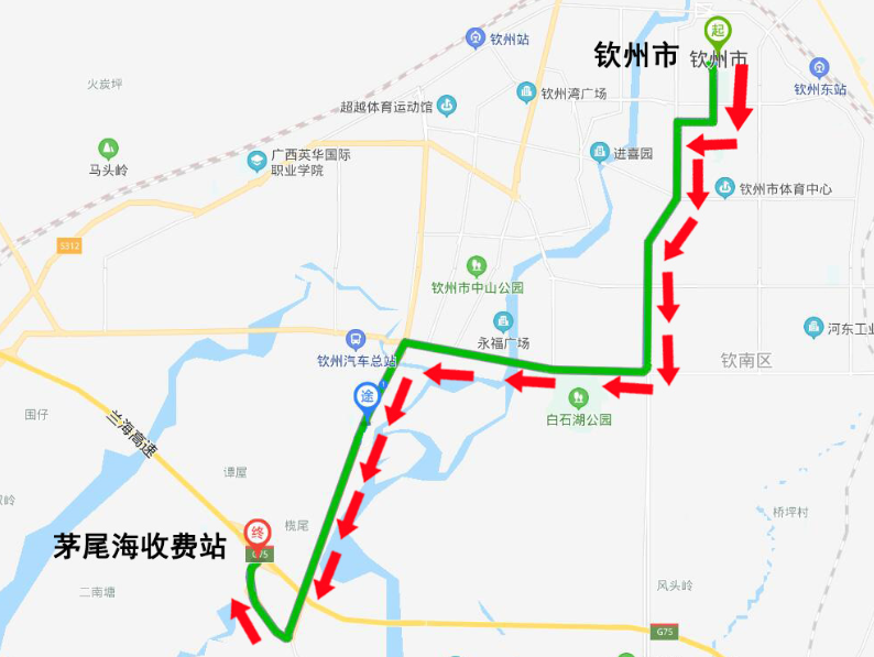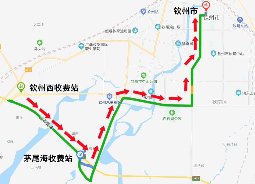 进城:1.大塘收费站→G325国道→钦州市区