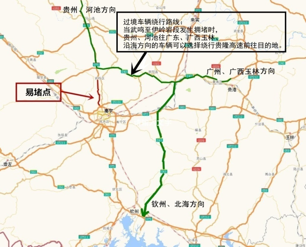 当G75兰海高速武鸣至伊岭岩段发生拥堵时,贵、渝、川方向前往广东、玉林、沿海方向的车辆,可以选择绕行S40苍硕高速(贵隆高速)前往目的地。