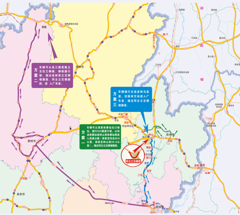 方案一:绕G78汕昆高速贺州东收费站、贺州收费站下高速→323国道→钟山县→英家、同安、平乐二塘收费站→G65包茂高速。