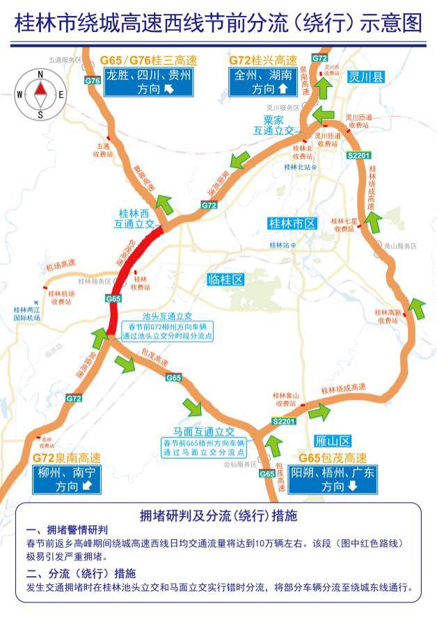由北往南拥堵时车辆分流路线:桂林西立交→粟家立交→桂林绕城东线。