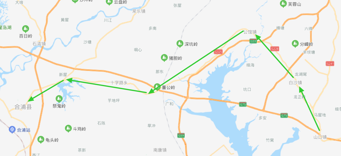 G75兰海高速→山口收费站→G228国道→公馆镇→G325国道→十字路乡→G325国道→合浦