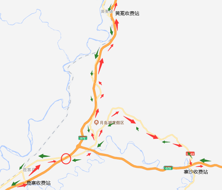 2.G72泉南高速柳州往桂林方向从鹿寨收费站出走G322国道绕行至黄冕收费站上;G78梧柳高速柳州往梧州方向从鹿寨收费站出走G323国道至G322国道绕行至鹿寨收费站上。(红色箭头)