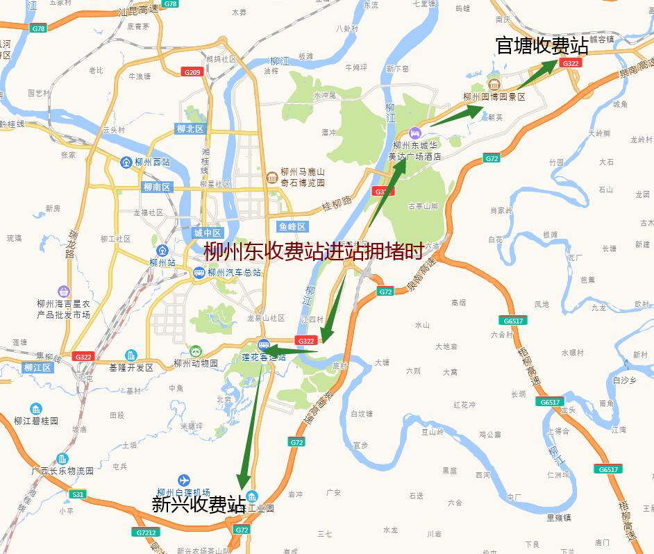 1.G72泉南高速桂林往柳州方向从黄冕收费站出走G322国道绕行至鹿寨收费站上;G78梧柳高速梧州往柳州方向从寨沙收费站出走G322国道至G323国道绕行至鹿寨收费站上。(绿色箭头)