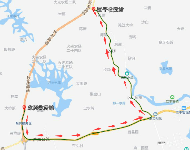 3.新福收费站拥堵时:往钦州方向的车辆→平朗收费站出口→X480县道→平朗乡→新福镇;往六景方向的车辆→旧州镇收费站出口→旧州镇→X304县道→新福镇方向。