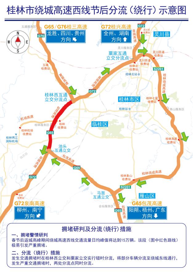 由北往南拥堵时车辆分流路线:桂林西立交→粟家立交→桂林绕城东线。