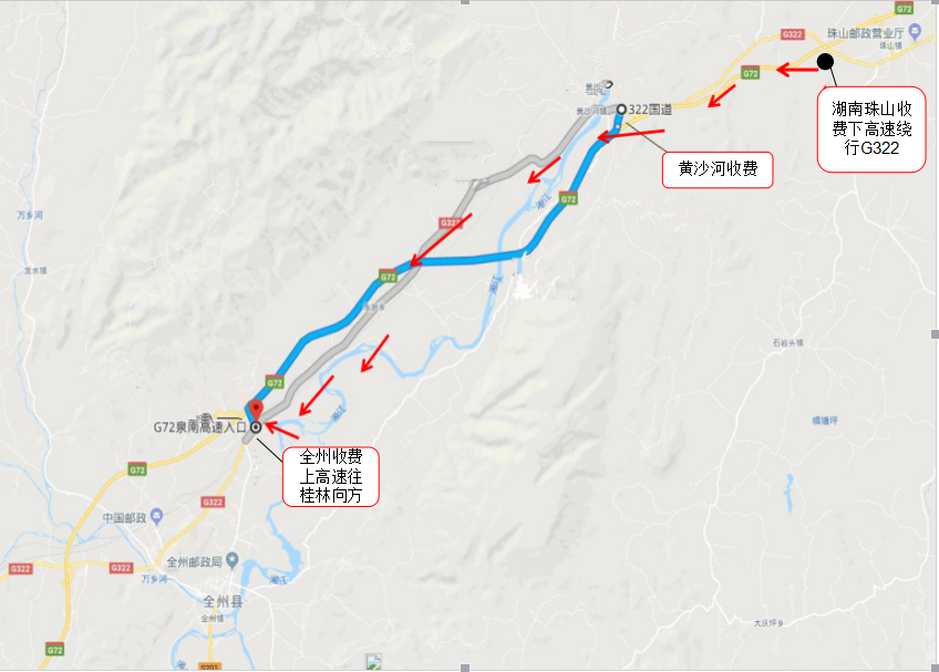 1.当黄沙河收费站站前(入口)出现拥堵,建议走(南往北)322国道→珠山收费站上高速;车辆(北往南)走322国道→全州北收费站上高速。