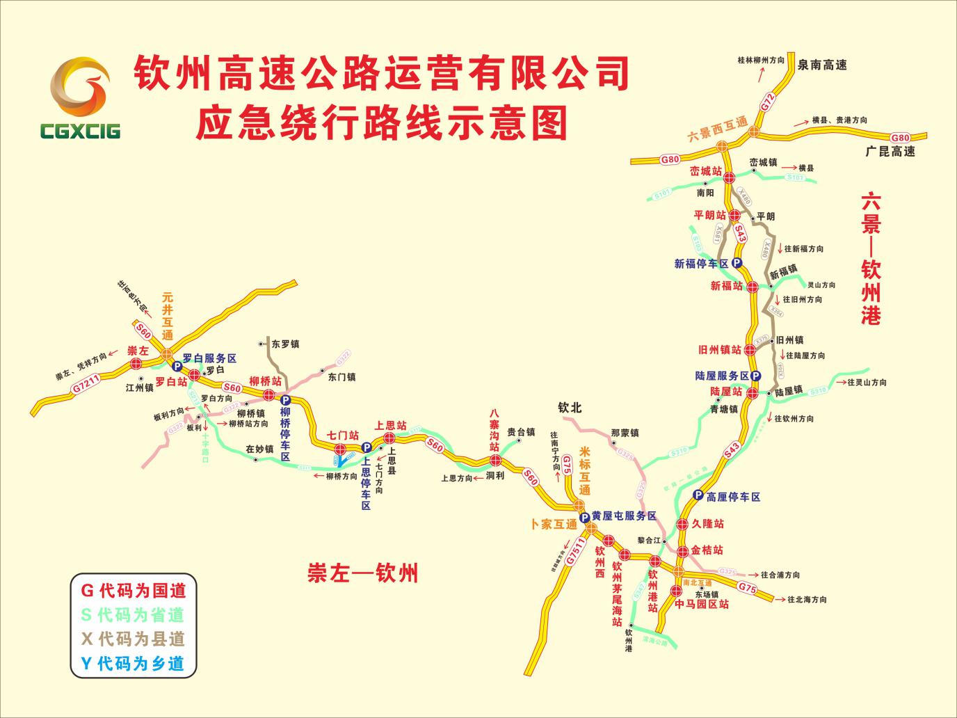 1.罗白收费站拥堵时:往崇左方向车辆→柳桥收费站出口→G322国道→柳桥镇→S213省道→罗白乡;往钦州方向车辆→崇左站出口→S213省道→柳桥方向行驶。