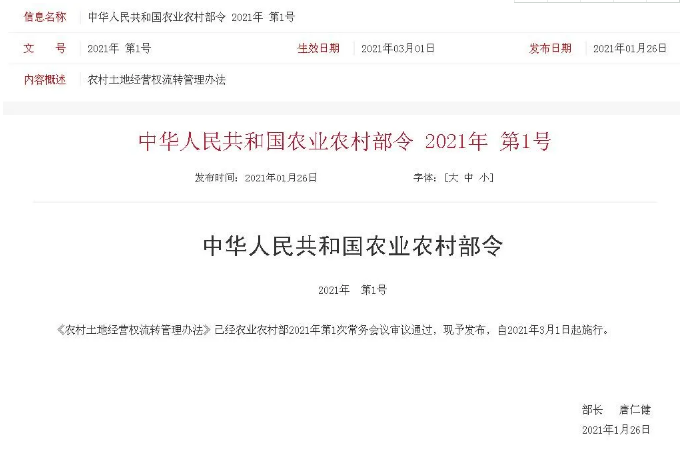 编辑者:农业农村部日前正式发布《农村土地经营权流转管理办法》,这意味着原农业部2005年颁布的《农村土地承包经营权流转管理办法》完成大修,《办法》将于2021年3月1日起施行,为土地经营权规范有序流转提供制度保障。