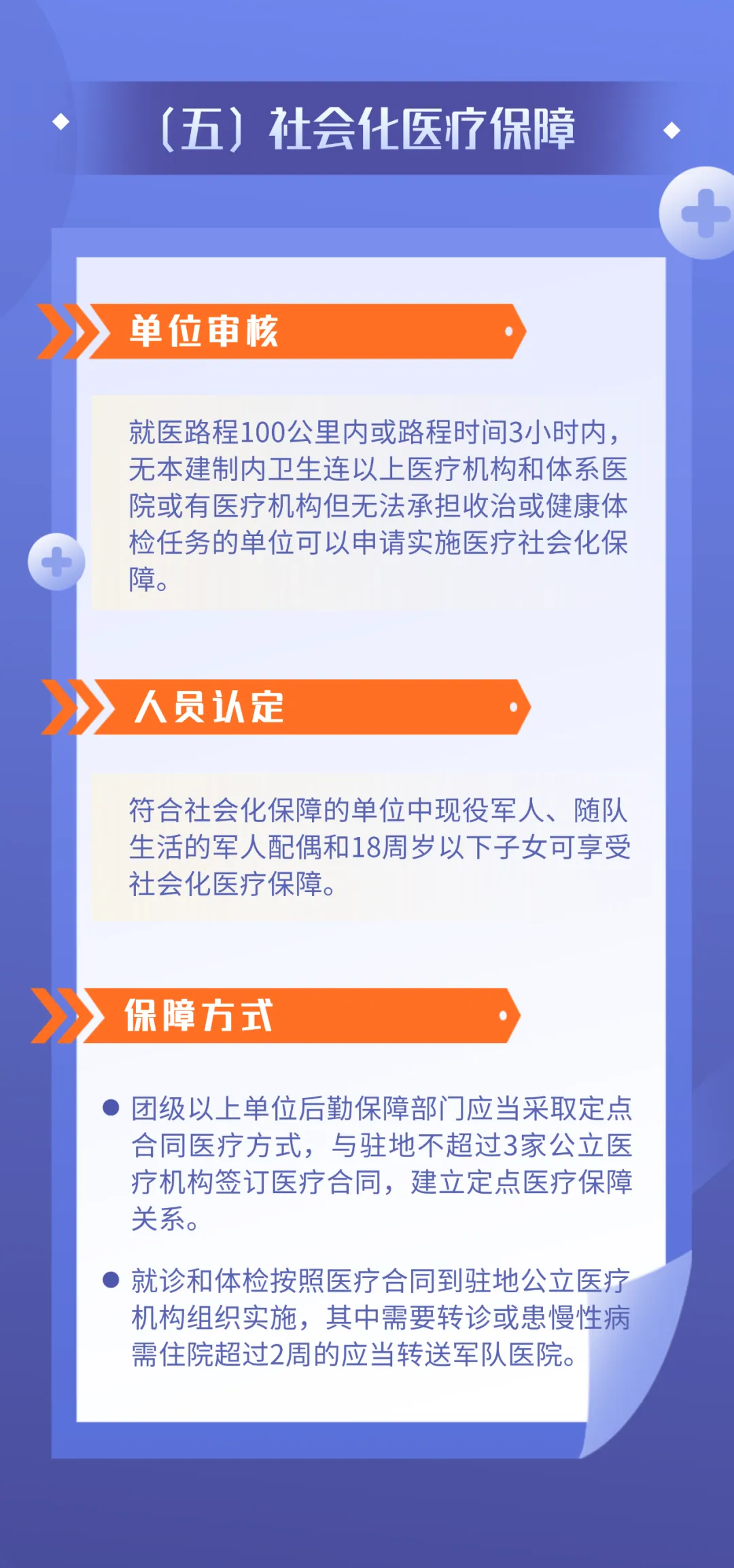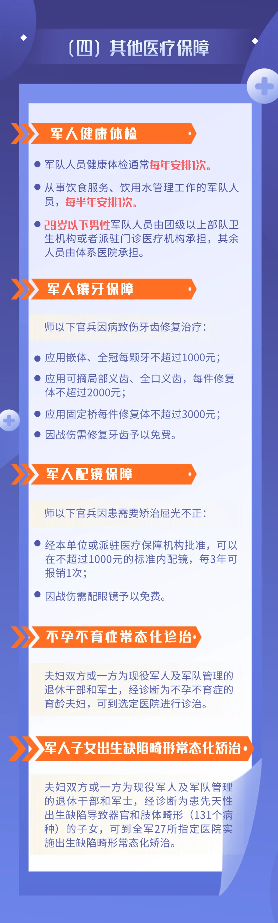 免费医疗:军人(所有军官、军士、义务兵)、烈士、因公牺牲军人、病故军人的配偶和18岁以下子女,以及烈士、因公牺牲军人的父母享受免费医疗。