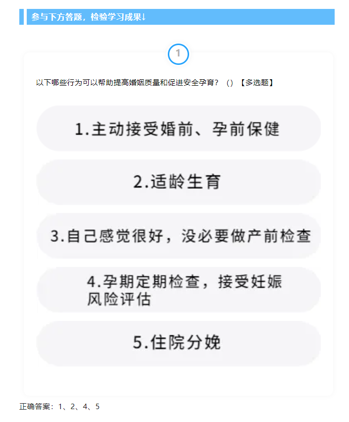 主动接受婚前和孕前保健,适龄生育,孕期遵医嘱规范接受产前检查和妊娠风险筛查评估,住院分娩。