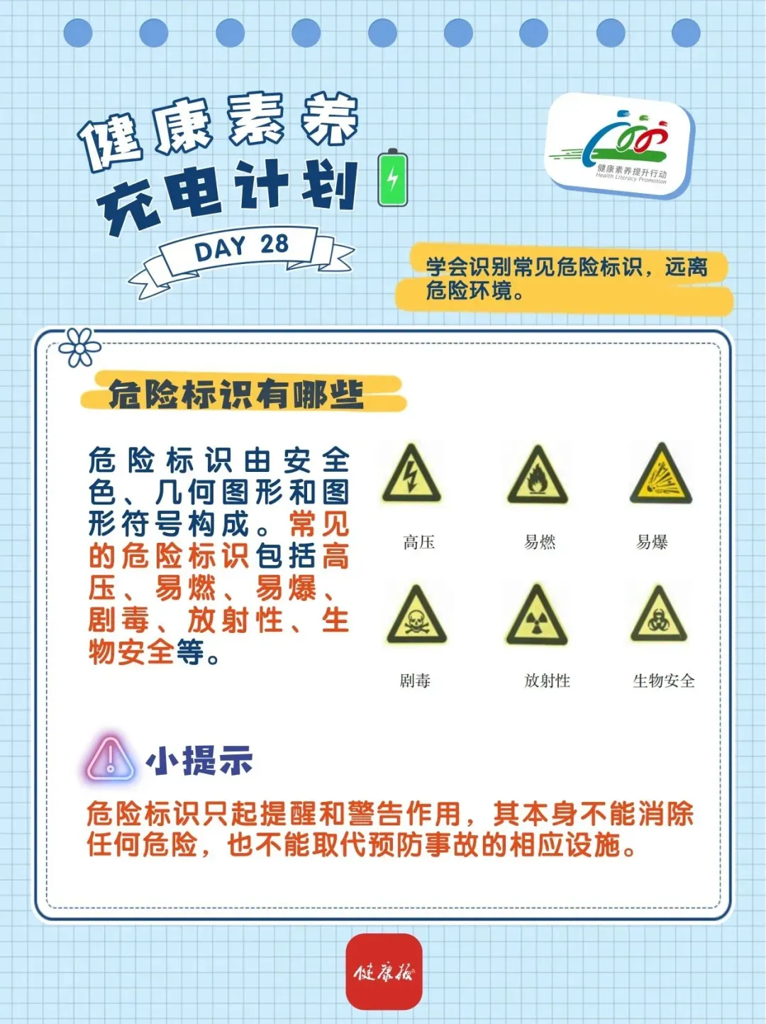 为倡导文明健康生活方式,提升居民健康素养水平,“健康八桂”微信公众号聚焦《中国公民健康素养——基本知识与技能(2024年版)》(简称“健康素养66条”)开展健康知识普及。本期内容为:常见的危险标识有哪些?