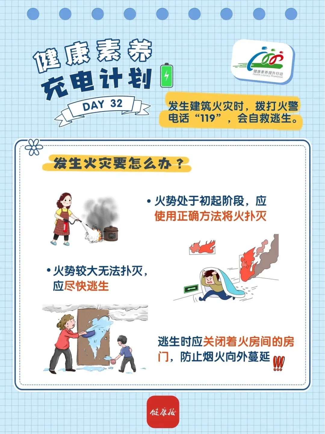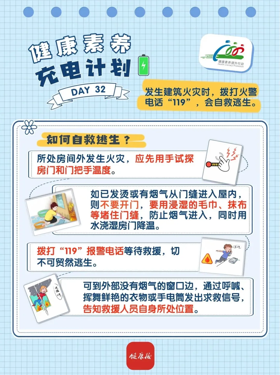 为倡导文明健康生活方式,提升居民健康素养水平,“健康八桂”微信公众号聚焦《中国公民健康素养——基本知识与技能(2024年版)》(简称“健康素养66条”)开展健康知识普及。本期内容为:发生火灾时该怎么自救逃生?