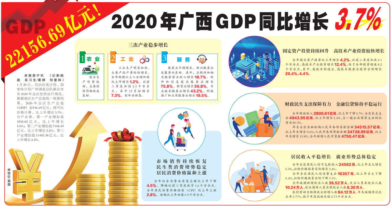 1月20日,自治区统计局、国家统计局广西调查总队联合发布2020年全区经济运行情况,根据地区生产总值统一核算结果,2020年全区生产总值(GDP)22156.69亿元,按可比价格计算,比上年增长3.7%。分产业看,第一产业增加值3555.82亿元,比上年增长5.0%;第二产业增加值7108.49亿元,比上年增长2.2%;第三产业增加值11492.38亿元,比上年增长4.2%。