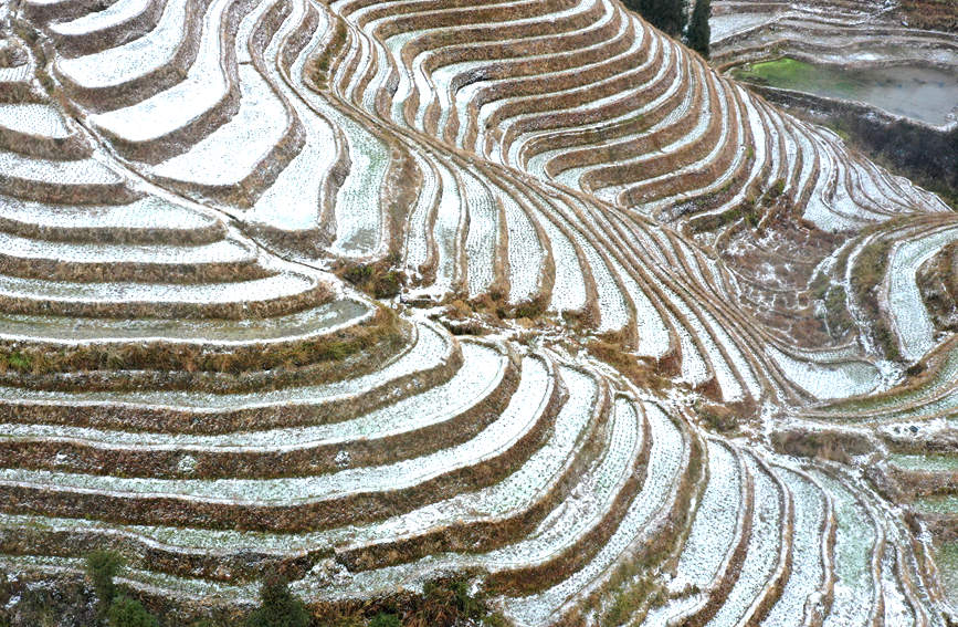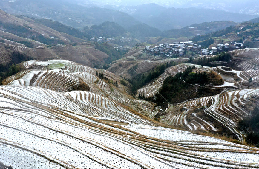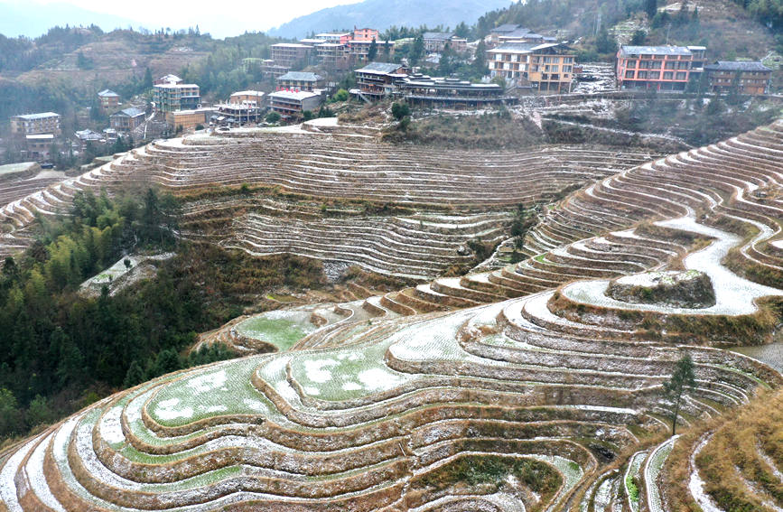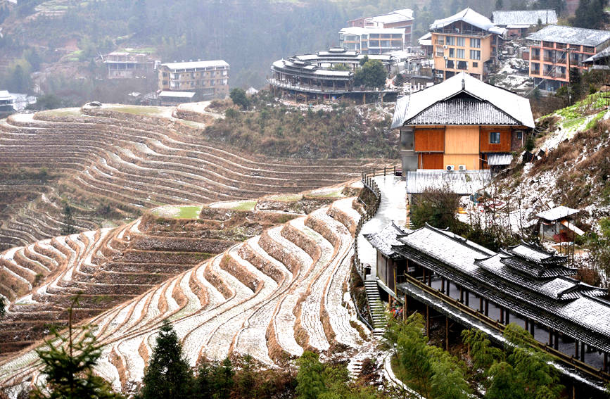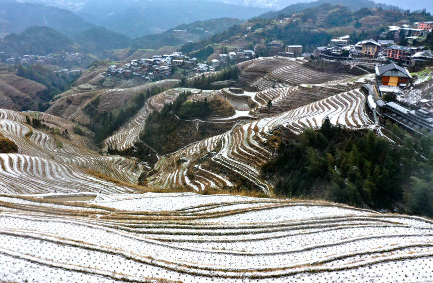 2月20日,广西桂林市龙胜各族自治县龙脊梯田迎来今年首场降雪。放眼望去,皑皑白雪把层层叠叠的梯田和当地错落有致的吊脚楼装扮成一幅瑞雪兆丰年的壮丽景观,美不胜收。(陈燕 潘志祥 潘勇干)