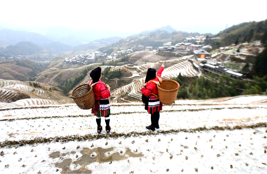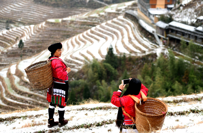 龙脊梯田景区,当地村民在观赏雪景。潘志祥 摄