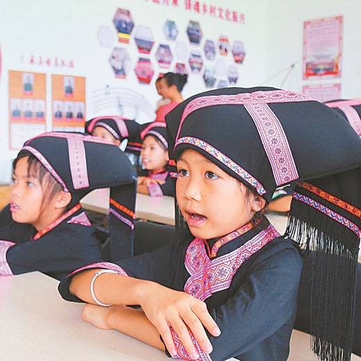 小学生在教室里认真学唱高腔诗雷。 均为班思义 摄