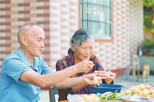 8月27日,在贺州市八步区莲塘镇莲塘村一个温馨的农家庭院里,刘国桃和妻子在制作豆腐酿和辣椒酿。