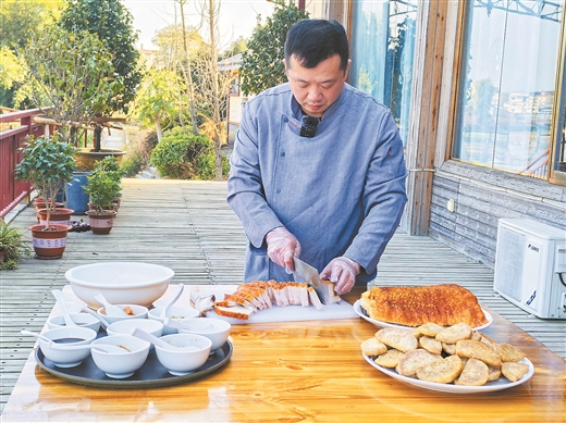 “这道菜传承了中原南迁的梅干菜焖肉技法,要经过煮、炸、腌、蒸四道工序。”朱勇边说边将肥瘦相间的五花肉焯水,接着用针尖在温热的肉皮上均匀刺孔,随后下油锅。“滋滋滋”,油面瞬间沸腾,气泡从肉皮细孔涌出,在琥珀色油浪中欢腾。渐渐地,肉皮染上金棕色,虎皮纹如漓江石上镌刻千年的水波纹般灿烂绽开。