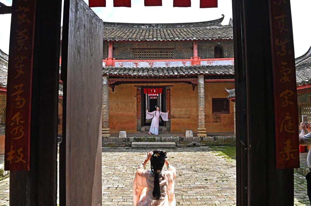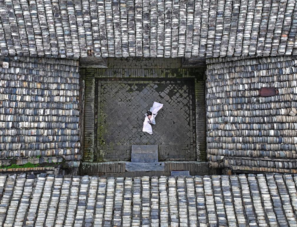 一名身着汉服的游客在大芦村古建筑群里起舞(8月16日摄,无人机照片)。