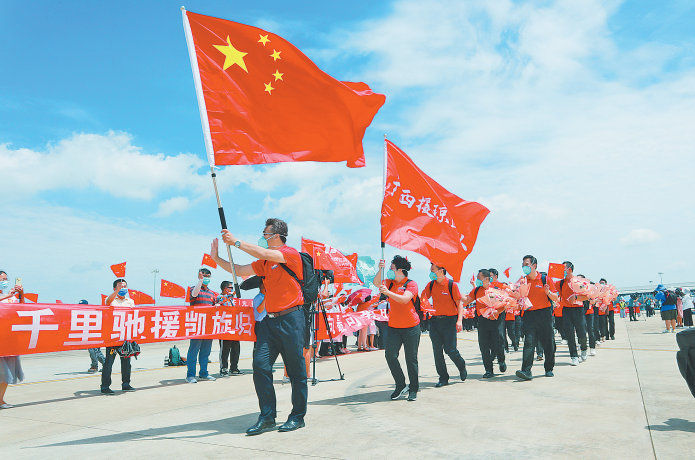 在海南疫情防控形势严峻时刻,广西积极响应国家号召,不到1天时间就组建了一支612人的广西援琼医疗队。20天来,医疗队始终牢记嘱托,与海南人民并肩携手,全力以赴投入海南疫情防控工作,进驻海口方舱医院不到24小时就开舱接治患者,累计收治了2644人,实现“工作队员零感染、救治病例零死亡、出院人员零回头”的目标,高质量完成了国家交给的援助任务。中共中央政治局委员、国务院副总理孙春兰亲切看望慰问医疗队方舱一线队员,对广西在海南疫情吃紧的关键时刻及时派出医疗队支援表示感谢,对医疗队工作给予了充分肯定。国家卫生健康委主任马晓伟、海南省委书记沈晓明对医疗队辛勤付出表达了慰问和感谢。