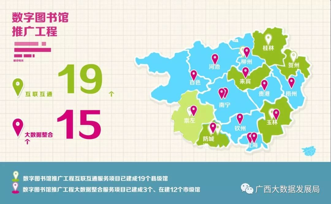 同时,我区积极实施公共图书馆“互联网+”行动计划,建立了信息交互可视化系统,实现了图书馆业务数据实时发布。为打造公共数字文化总枢纽、主阵地,搭建国家到基层的网络高速公路,提升区域性数字图书馆服务能力,广西图书馆承担了数图推广工程·基层图书馆互联互通及大数据整合项目,截止2018年,已完成容县、陆川等19个基层图书馆的互联互通,南宁、柳州、玉林3个市级图书馆的大数据整合。