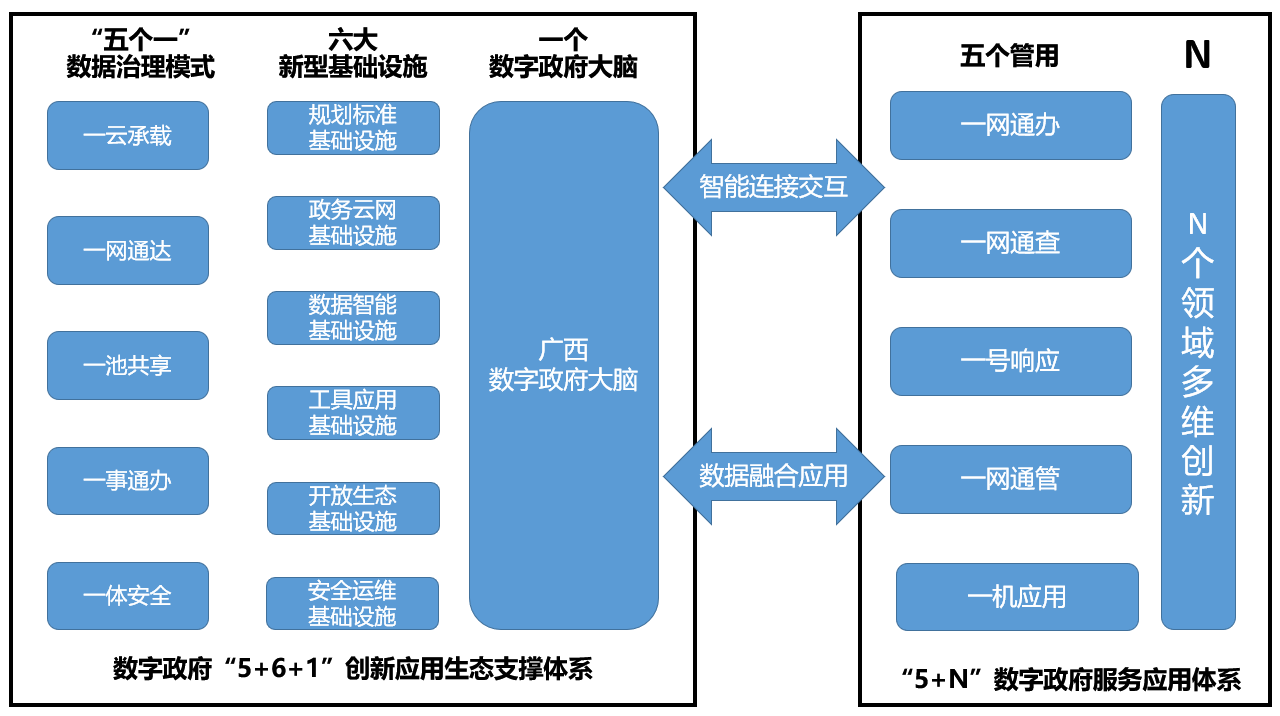 “一核驱动”支撑体系——基于“一云承载、一网通达、一池共享、一事通办、一体安全”的“五个一”政务数据治理模式所取得的成果,打造“规划标准、政务云网、数据智能、工具应用、开放生态、安全运维”等六大数字政府新型基础设施,建设一个数字政府大脑,构建广西数字政府“5+6+1”创新应用生态支撑体系。