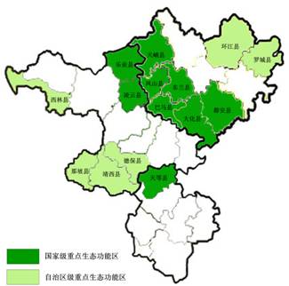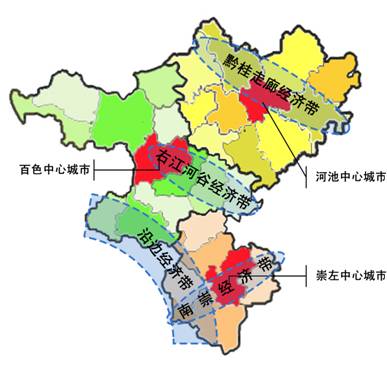 桂西资源富集区(以下简称桂西地区)是指地处广西壮族自治区西部的河池、百色、崇左三市所辖的30个县(市、区),土地面积8.71万平方公里,占全区总面积37.8%。2010年末总人口1017万人,占全区总人口19.7%,是广西少数民族主要聚居地区,集革命老区、边疆地区、民族地区、连片特困地区、大石山区和水库库区于一体,具有资源富集、生态脆弱、沿边开放、扶贫开发、西南出海大通道支撑点等鲜明特征,是我国西南自然资源丰富、民族文化浓郁、区位条件较好、发展潜力较大的地区,是国家西部大开发“十二五”规划明确支持建设的8个重点能源资源富集地区之一。