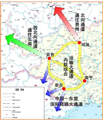 按照“三核四带七组团”的空间布局,统筹推进铁路、公路、水运、机场等基础设施建设,加强各种运输方式衔接,构建连通内外、通江达海、功能配套、安全高效的综合交通运输网络,打通连接我国西南出海大通道的重要节点,加快形成崇左、百色通往东盟国家的国际陆路通道,河池、百色通往贵州的北向通道,百色通往云南的西北向通道等3条出省出边综合运输大通道,以及崇左、百色沿边地区通道,河池、百色、崇左相互连接通道等2条内联综合运输大通道。