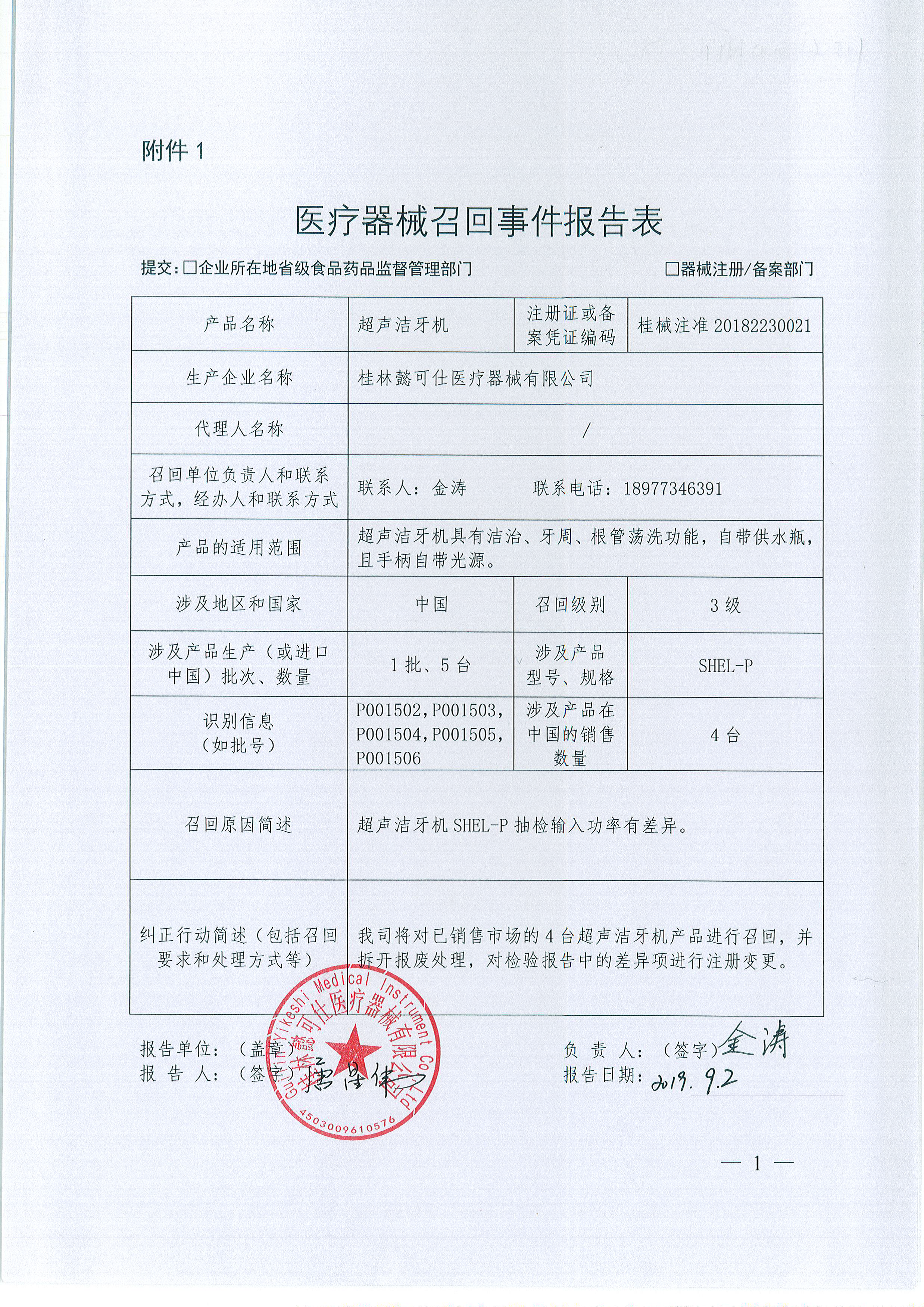 桂林懿可仕医疗器械有限公司报告,按照GB9706.1-2007医用电器设备项下检测,输入功率不符合要求,桂林懿可仕医疗器械有限公司对其生产和销售的四台超声洁牙机(SHEL-P)(注册号:桂械注准20182230021)实施主动召回。召回级别为三级 。涉及产品的型号、规格及批次等详细信息见《医疗器械召回事件报告表》。