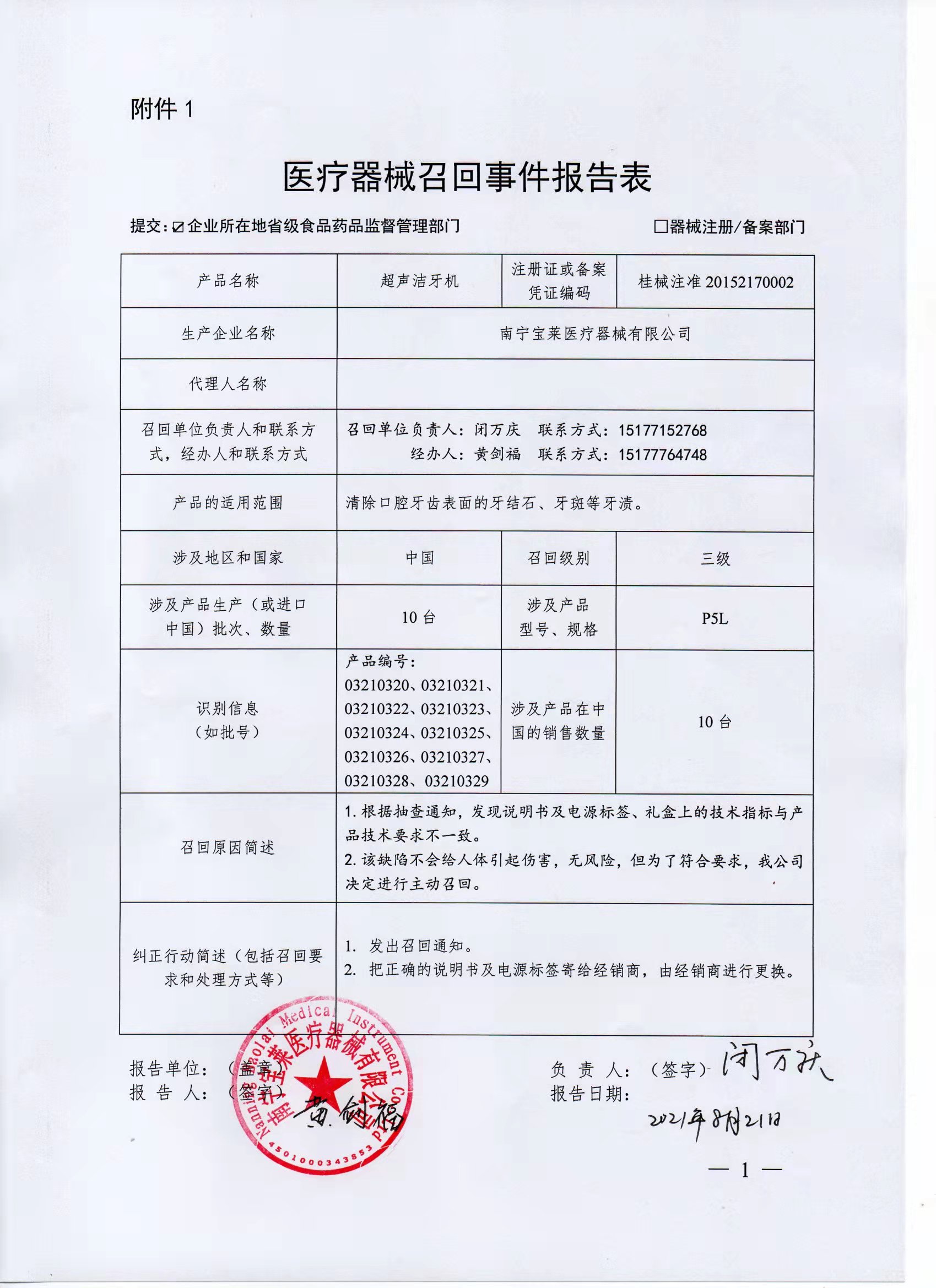 南宁宝莱医疗器械有限公司报告,由于说明书及电源标签、礼盒上的技术指标与产品技术要求不一致,南宁宝莱医疗器械有限公司对其生产的超声洁牙机(型号/规格:P5L,批号:P5L21022601,产品编号:03210320、03210321、03210322、03210323、03210324、03210325、03210326、03210327、03210328、03210329)进行主动召回。召回级别为三级。涉及产品的型号、规格及批次等详细信息见《医疗器械召回事件报告表》。