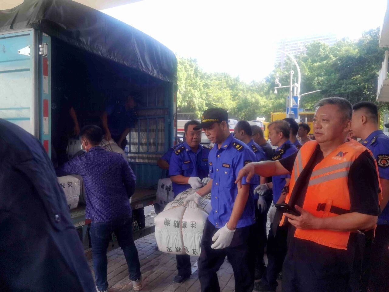 消防、公安、蓝盾应急救援等多支队伍在现场搬运救援物资。